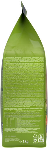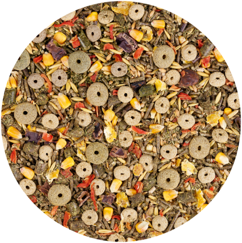 Samenstelling: luzerne* 11,1%, Tarwe*, Gras, gedroogd* 10%, tarwezemelen*, haver*, Bietenmelassepulp, zonnebloemkoek, Mais*, haverzemelengrint*, Gerst*, haverschillen*, koolzaadschroot, Moutkiemen*, maïsvlokken*, johannesbrood, gedroogd* 2%, Wortelen, gedroogd* 2%, maïsmeel*, tijm, gedroogd* 1,5%, Tarwemeel*, pepermuntbladeren, gedroogd* 0,8%, calciumcarbonaat*, Haverschillen*, Bietenmelassepulp, kamillebloesem, gedroogd* 0,27%, natriumchloride*, Hibiscusbloemen, gedroogd* 0,18%, inuline*, yucca Schidigera poeder*, koolzaadolie. *=Natuurlijke ingrediënten