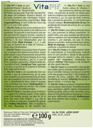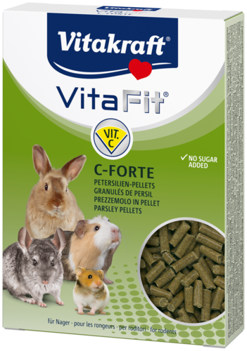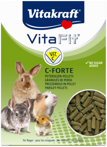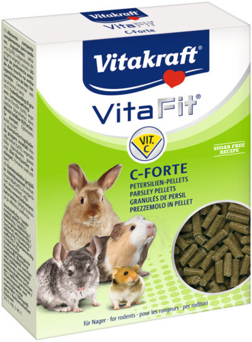 Wil je de weerstand van je knaagdier of konijn ondersteunen? Vitakraft® VITA Fit C-Forte peterseliekorrels zijn een smakelijke en natuurlijke bron van vitamine C. Essentieel voor cavia’s, die zelf geen vitamine C aanmaken, en een waardevolle aanvulling voor andere knaagdieren en konijnen bij stress, ziekte of zwangerschap. Zonder kleurstoffen, conserveringsmiddelen of antioxidanten. Een gezonde boost voor het immuunsysteem van je huisdier!