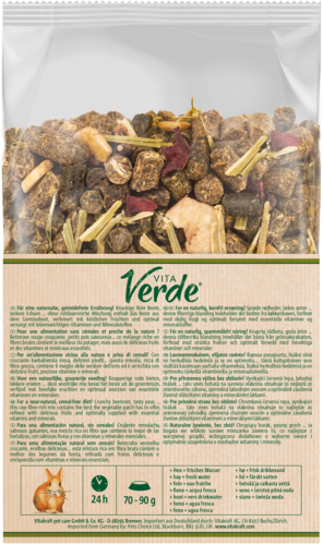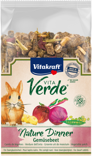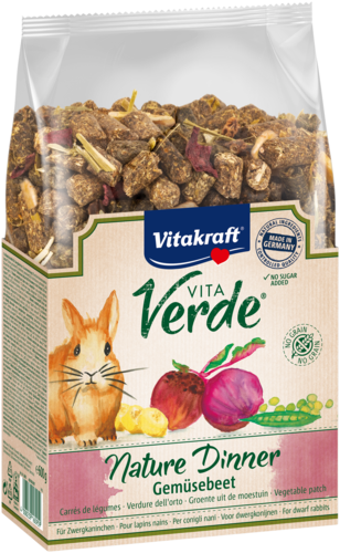 Vitakraft® Vita Verde® Nature Dinner 'Groentetuin' biedt een heerlijke, graanvrije mix van natuurlijke ingrediënten zoals krokante rode biet en smakelijke erwten, speciaal voor dwergkonijnen die van groente houden! Deze uitgebalanceerde voeding is niet alleen ideaal voor konijnen die een graanvrij dieet belangrijk vinden, maar bevat ook waardevolle voedingsstoffen die bijdragen aan een gezond en gelukkig leven. De ruwe vezels bevorderen een goede spijsvertering en ondersteunen de slijtage van de tanden, terwijl de heerlijke vruchten het geheel afmaken. Zonder toegevoegde suikers, kunstmatige kleurstoffen en conserveringsmiddelen. Met een krachtige anti-stankformule die onaangename geurtjes voorkomt en een verpakkingsvernieuwing die milieuvriendelijker is. 100% genieten voor jouw konijn!