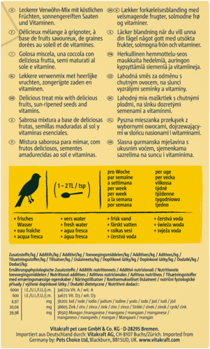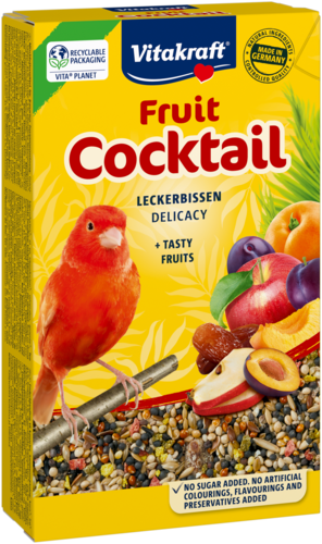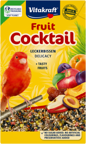 Is jouw kanarie ook een echte levensgenieter? Met Vitakraft® Fruit Cocktail geef je je vrolijke kwebbelkous een heerlijke traktatie boordevol fruitige afwisseling. Deze knapperige mix bevat sappige stukjes appel, pruim en abrikoos, gecombineerd met zongerijpte zaden voor een gezonde energieboost. Bovendien zit de mix vol vitamine A en D, ter ondersteuning van de gezondheid en vitaliteit van je gevederde vriend. Zonder toegevoegde suikers, conserveringsmiddelen of kunstmatige kleur- en smaakstoffen, dus puur genieten. Met Fruit Cocktail maak je van elk verwenmoment een klein feestje!