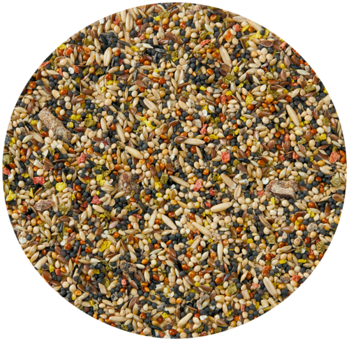 Samenstelling: granen, zaden 45,0%, vruchten 5,0% (pruimen, gedroogd 2%, perzik, gedroogd 0,4%, appel, gedroogd 0,4%), plantaardige bijproducten*, eieren en eiproducten*, mineralen, groenten*. *=natuurlijke ingrediënten