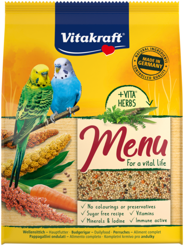 Vitakraft Menu bevat alles wat jouw parkiet nodig heeft: eiwitten, vetten, vitamines en mineralen. Daarnaast is deze voeding verrijkt met VITA® Herbs – een zorgvuldig geselecteerde combinatie van kruiden zoals peterselie, ribkruid en tijm, die het welzijn van je parkiet ondersteunen.