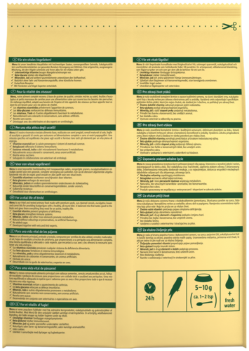 Samenstelling: Granen* (gierst 89,2%), zaden* 3,5%, mineralen*, Groenten* (Wortelen, gedroogd 1%), peterselie, gedroogd* 0,5%, tijm, gedroogd* 0,25%, smalle weegbree, gedroogd* 0,25%, eucalyptusbladeren gedroogd* 0,2%, Oliën en vetten, gisten (bèta Glucanen 80mg/kg). *=Natuurlijke ingrediënten