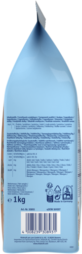 graan* (o.a. tarwe 38 %), zaden* 17,3%, noten* (pinda’s 4%), insecten* 3% (vliegenlarven, gedroogd 3%), vruchten* (dadels, gedroogd 2%), mineralen*, oliën en vetten. *=natural ingredients