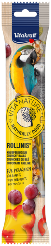 De Vitakraft® VITA NATURE® Rollinis® met fijne zaden, vruchten en groenten zijn de ideale combinatie van een smakelijke snack en een actief speeltje. Dankzij hun ronde vorm rollen de balletjes over de bodem, waardoor je papegaai op een natuurlijke manier moeite moet doen voor zijn traktatie. Bereid zonder kunstmatige kleurstoffen en antioxidanten, en Aroma Fresh verpakt voor maximale knapperigheid. Een verrukkelijke en uitdagende traktatie in één!