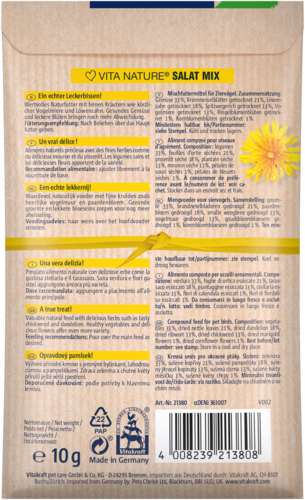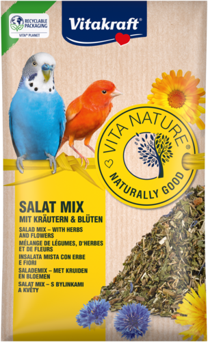 Wil je jouw vogel verwennen met een natuurlijke en gevarieerde traktatie? De Vitakraft® Salade Mix brengt afwisseling in het vogelmenu met een mix van fijne kruiden, groenten en bloemen. Geschikt voor alle vogelsoorten en eenvoudig over de hoofdvoeding te strooien. Bevat natuurlijke vitamines en eiwitten, zonder antioxidanten, kleurstoffen en conserveringsmiddelen. Een pure en verantwoorde lekkernij!
